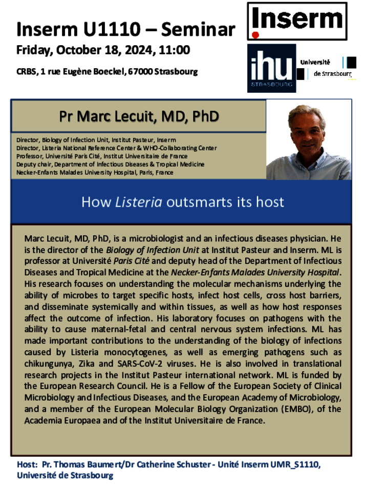The speaker will give his seminar at the Amphitheater CRBS, 1 rue Eugène Boeckel, Strasbourg with the title “How Listeria outsmarts its host”.